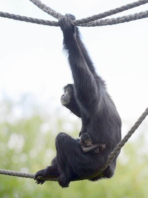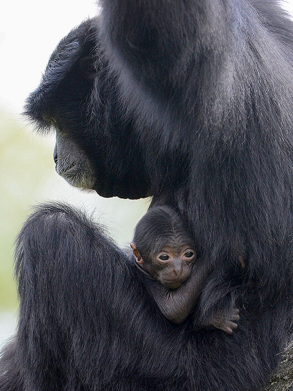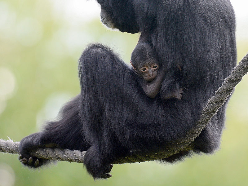 Am 14. Juli erscheint Pelangi morgens auf der Anlage und schwingt sich in die höchsten Wipfel. Doch die Tierpfleger haben das freudige Ereignis längst bemerkt. Denn noch vor dem Öffnen der Tür zur Anlage gibt es eine morgentliche Begrüßung im Haus. Hier wird der Nachwuchs natürlich sofort bemerkt und ein erster prüfender Blick zeigt, dass das Neugeborene einen gesunden Eindruck macht. Mädchen oder Junge? Diese Frage wird wohl noch eine ganze Weile unbeantwortet bleiben. In den kommenden Wochen bleibt das Jungtier eng an Mutters Bauch geschmiegt. Hier ist es sicher, warm und reichlich Milch ist in greifbarer Nähe.