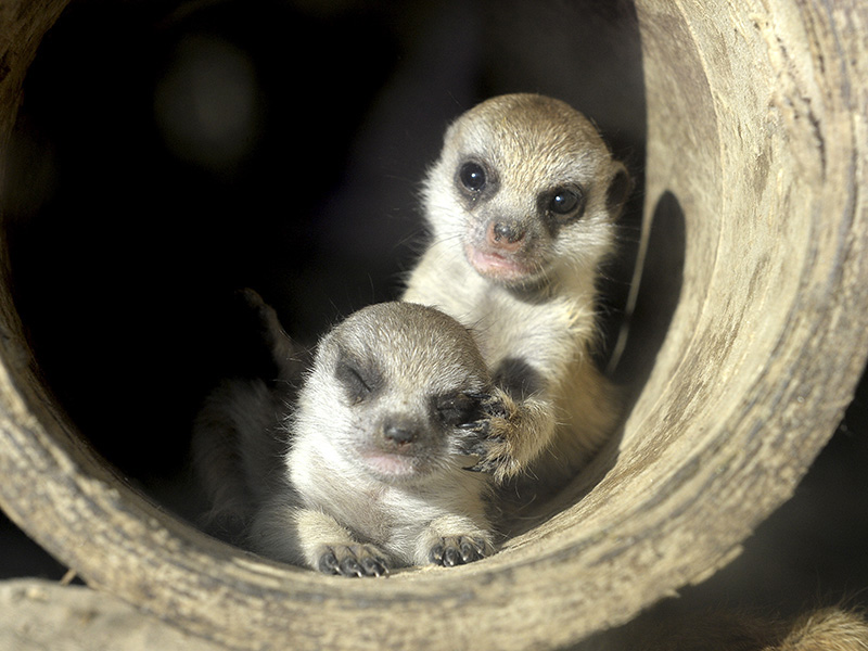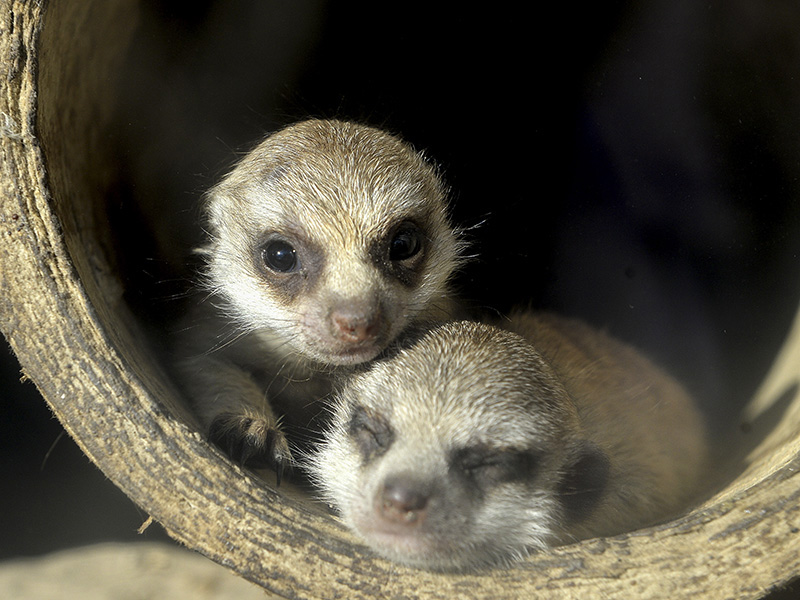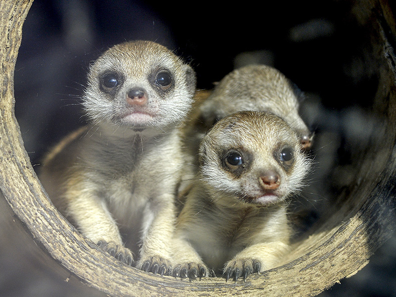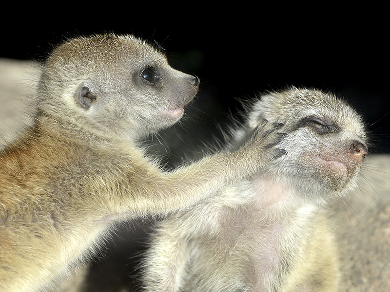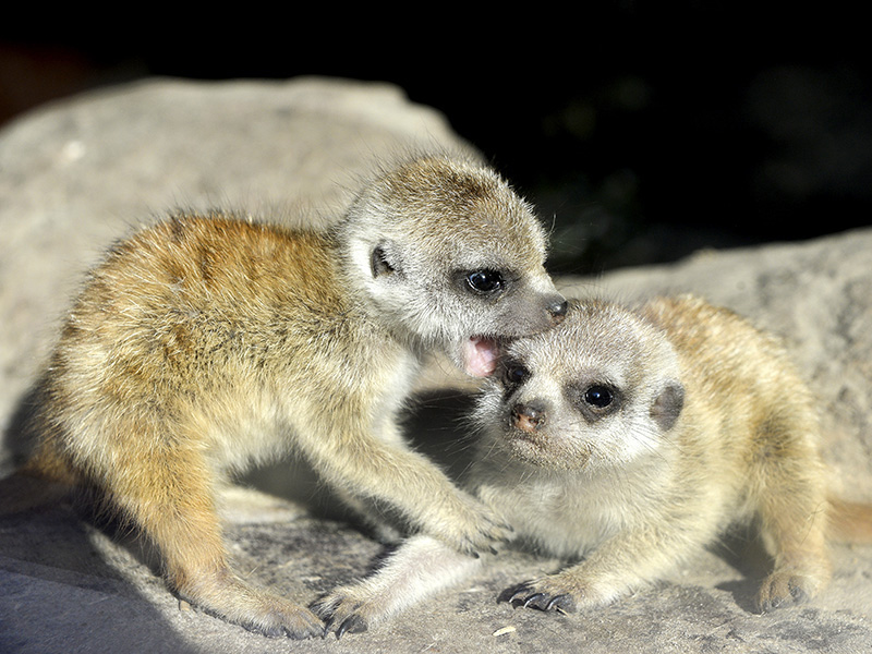 Nach längerer Pause in der Erdmännchengruppe hat sich nun wieder ein Pärchen zusammengefunden. Das Ergebnis kann sich sehen lassen: Mitte August erblickten 5 Jungtiere das Licht der Welt. Anfänglich noch Nesthocker, suchten sie eher Schutz in der Höhle und Wärme unter der künstlichen Sonne. Doch nun, nach wenigen Wochen geht es turbulent zu, denn auch Erdmännchen spielen und raufen für ihr Leben gern. Sehen Sie selbst...