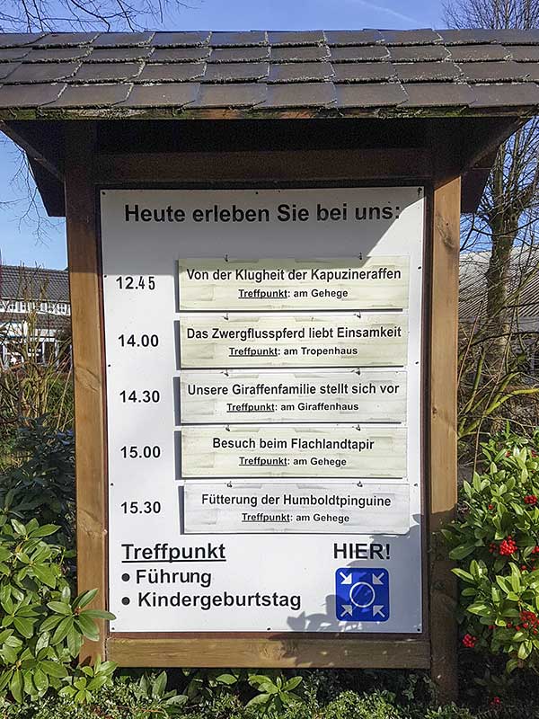 Welche Tierart wann besucht wird, richtet sich nach vielen Aspekten (Situation in der Tiergruppe, Dienstplan der Tierpfleger, Reinigungs- und Reparaturarbeiten, Wetter u.v.m.). Aus diesem Grund erfahren Sie das Programm beim Betreten des Parks auf einer großen Schautafel am Eingang. Da wir hier sehr variabel sein müssen, können wir Tierart und Uhrzeit nicht im Internet ankündigen.
